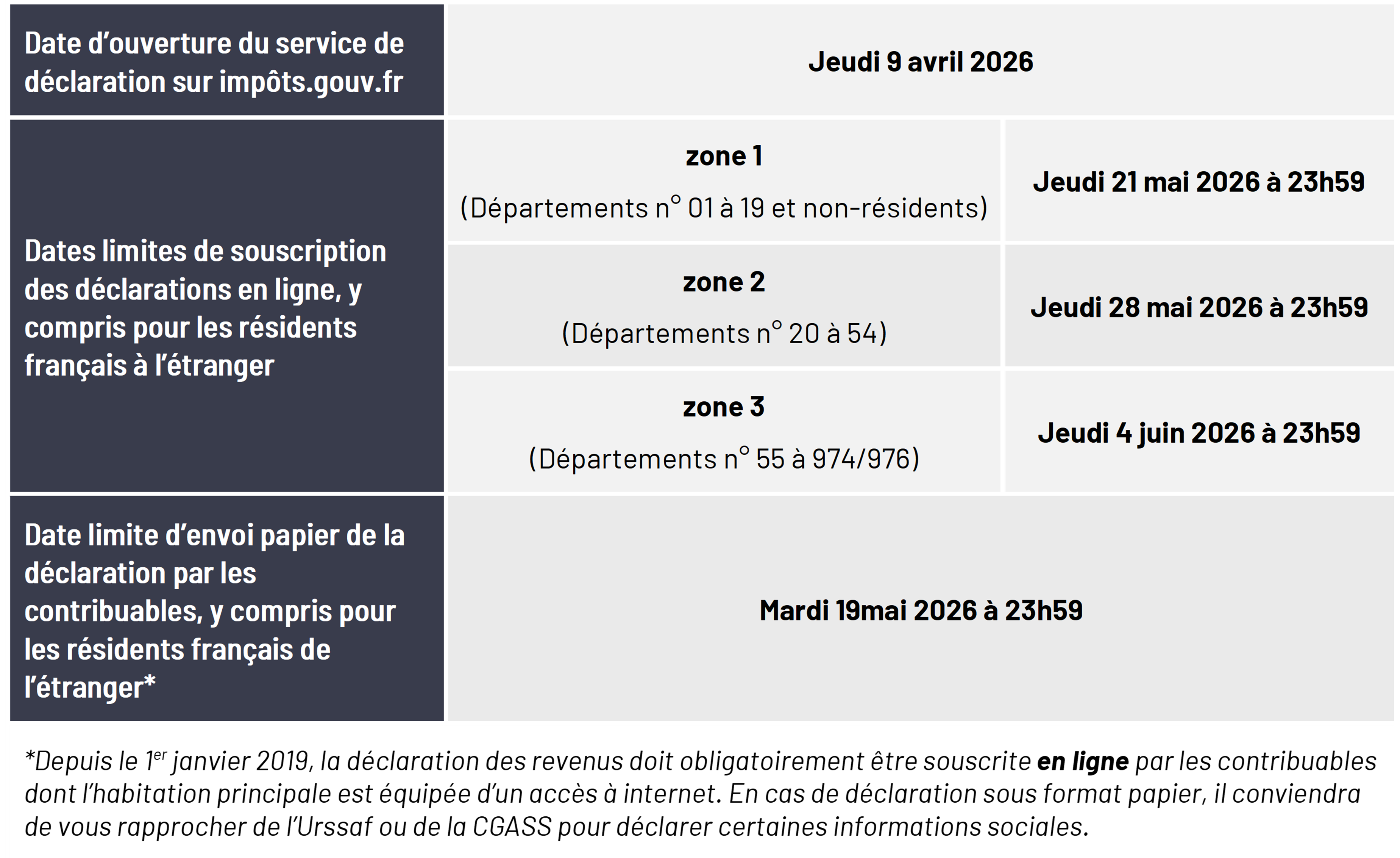 L'administration a publié les dates clés de la campagne de déclaration d'IR 2025 sur les revenus 2025, elle commencera le jeudi 9 avril 2026. Pour se terminer aux dates suivantes :