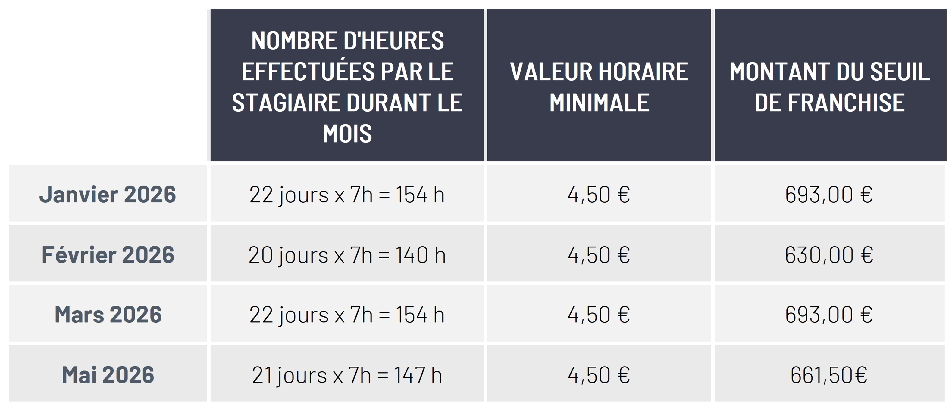 Le seuil de franchise est déterminé par le produit d’un pourcentage du plafond horaire de la Sécurité sociale (15 % de 30 € en 2026, soit 4,50 €) et du nombre d'heures de stage réellement effectuées au cours du mois considéré (art. D. 242-2-1 du CSS).
