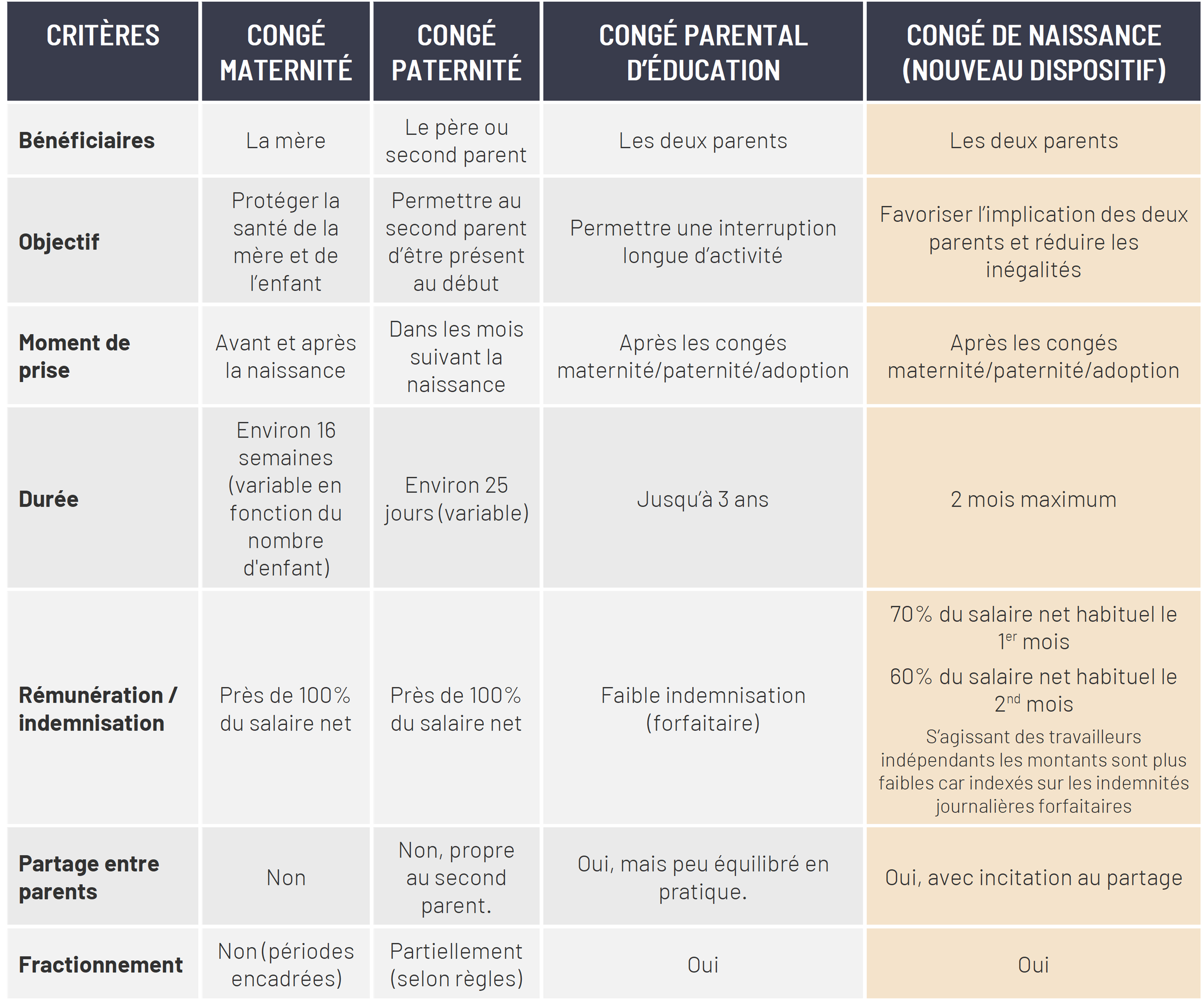 Le congé de naissance est un congé supplémentaire puisqu’il vient se cumuler avec le congé maternité, le congé paternité et le congé d’adoption. Il a vocation à remplacer progressivement le congé parental d’éducation, en proposant un modèle plus court mais mieux indemnisé, afin d’encourager un recours plus large par les parents, notamment les pères.