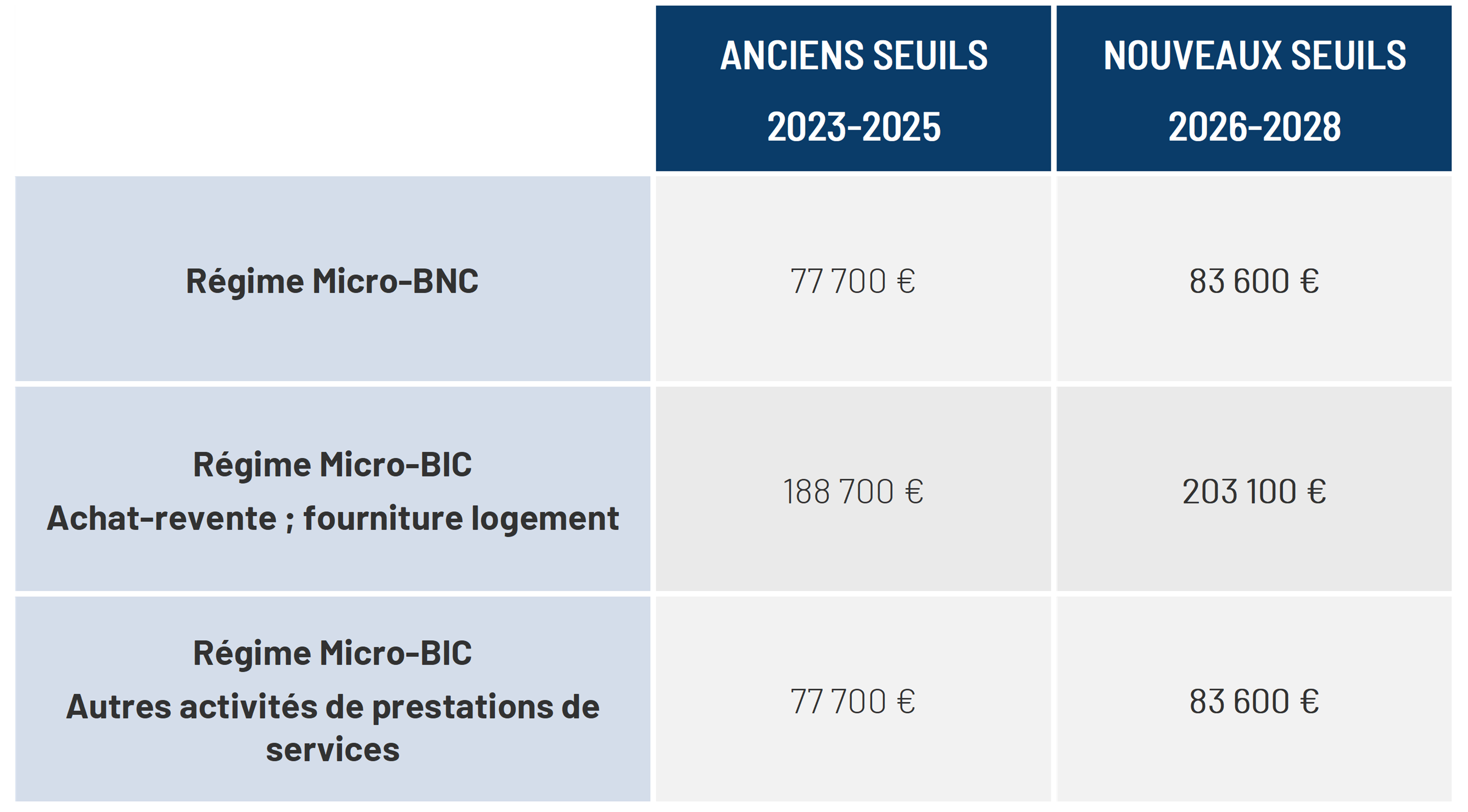 Suite à l'adoption de la loi de finances pour 2026 et conformément aux dispositions du Code général des impôts, qui prévoient que les limites des régimes d’imposition des entreprises doivent être revalorisés tous les 3 ans dans la même proportion que l’évolution triennale de la limite supérieure de la première tranche de l’impôt sur le revenu, puis arrondis à la centaine d’euros la plus proche, les nouveaux seuils à retenir pour la période 2026-2028 sont les suivants :